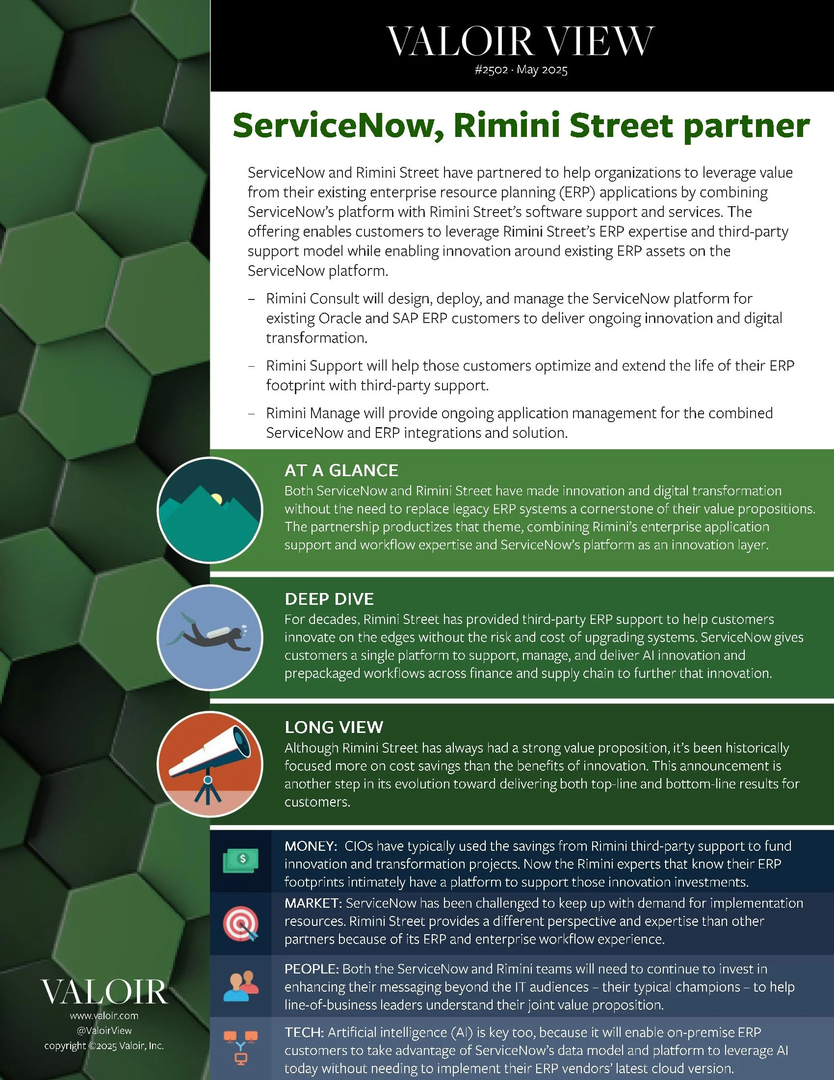 Both ServiceNow and Rimini Street have made innovation and digital transformation without the need to replace legacy ERP systems a cornerstone of their value propositions. The partnership productizes that theme, combining Rimini’s enterprise application support and workflow expertise and ServiceNow’s platform as an innovation layer. Read the Valoir View.